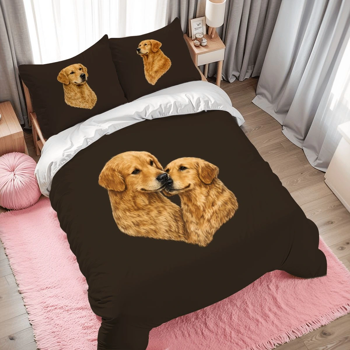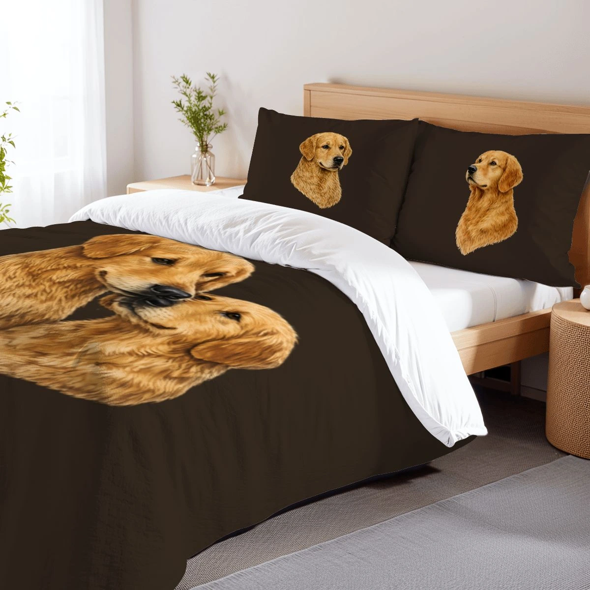 Celebrate your love for dogs with the Golden Retriever Full Duvet Cover Set, designed to bring warmth and personality to your bedroom. Featuring beautifully detailed golden retriever artwork on a rich brown background, this bedding set creates a cozy and heartwarming atmosphere perfect for dog lovers. The realistic illustration adds charm while the deep neutral tone blends effortlessly with rustic, modern, or farmhouse decor styles.